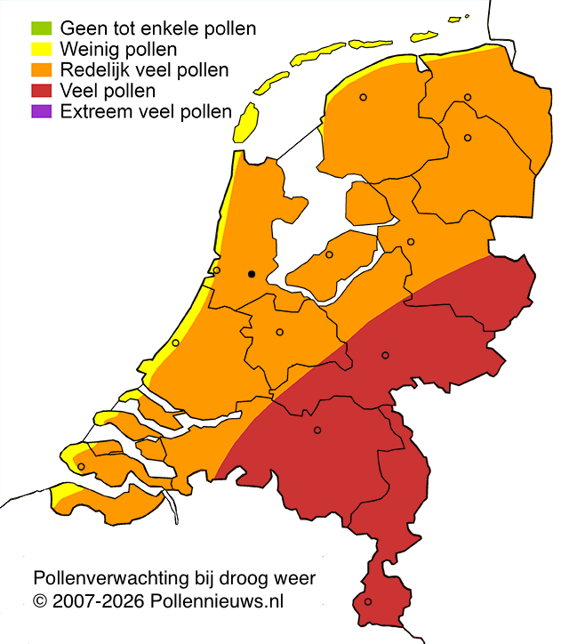 De weersomstandigheden zijn van enorme invloed op de pollendruk. Naast de temperatuur heeft bijvoorbeeld ook regen, de luchtvochtigheid, de windrichting en de windsnelheid invloed op de hoeveelheid pollen in de lucht. Het weer in Nederland kan behoorlijk grillig zijn en de lokale verschillen groot. Ver vooruit kijken blijft dan ook lastig. De staafgrafiek geeft een indicatie van de te verwachten pollendruk in de komende dagen.