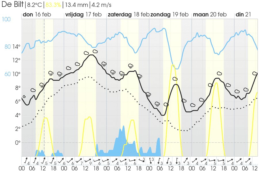 In een zogenaamd meteogram komen verschillende van deze weersfactoren samen. Je kunt dan de onderlinge relaties zien, zoals dag-nacht ritme. De zwarte lijn geeft de temperatuur weer, de blauwe lijn de luchtvochtigheid. Onderaan in het blauw de te verwachten neerslag, de windsnelheid en windrichting. De zwarte stippellijn is het dauwpunt en de gele lijn de instraling van de zon.