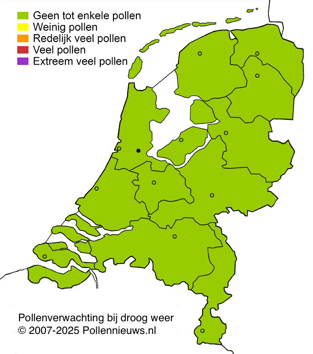 De weersomstandigheden zijn van enorme invloed op de pollendruk. Naast de temperatuur heeft bijvoorbeeld ook regen, de luchtvochtigheid, de windrichting en de windsnelheid invloed op de hoeveelheid pollen in de lucht. Het weer in Nederland kan behoorlijk grillig zijn en de lokale verschillen groot. Ver vooruit kijken blijft dan ook lastig. De staafgrafiek geeft een indicatie van de te verwachten pollendruk in de komende dagen. Op deze pagina is een overzicht te vinden van de verschillende weersfactoren die van invloed zijn op de pollendruk.